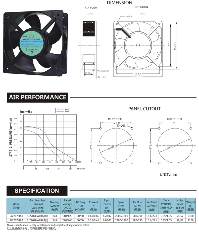 尺寸:205x205x72mm 框架:铝ADC-12 轴承:双滚珠轴承 电压:AC 110V 220V 380V 寿命:60 000Hours at 20℃--滚珠轴承 30 000Hours at 20℃--含油 工作温度:-20℃~70℃ 正常湿度 储存温度:-20℃~85℃ 正常湿度